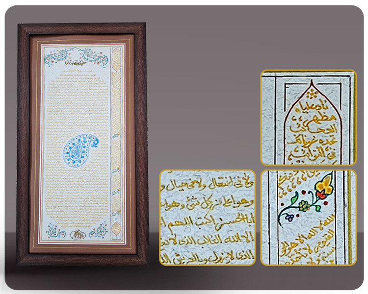 تمام متون کتابت شده با گلاب، زعفران، آب سرداب حضرت عباس (علیه السلام) و تربت حضرت سیدالشهداء (علیه السلام) میباشد.